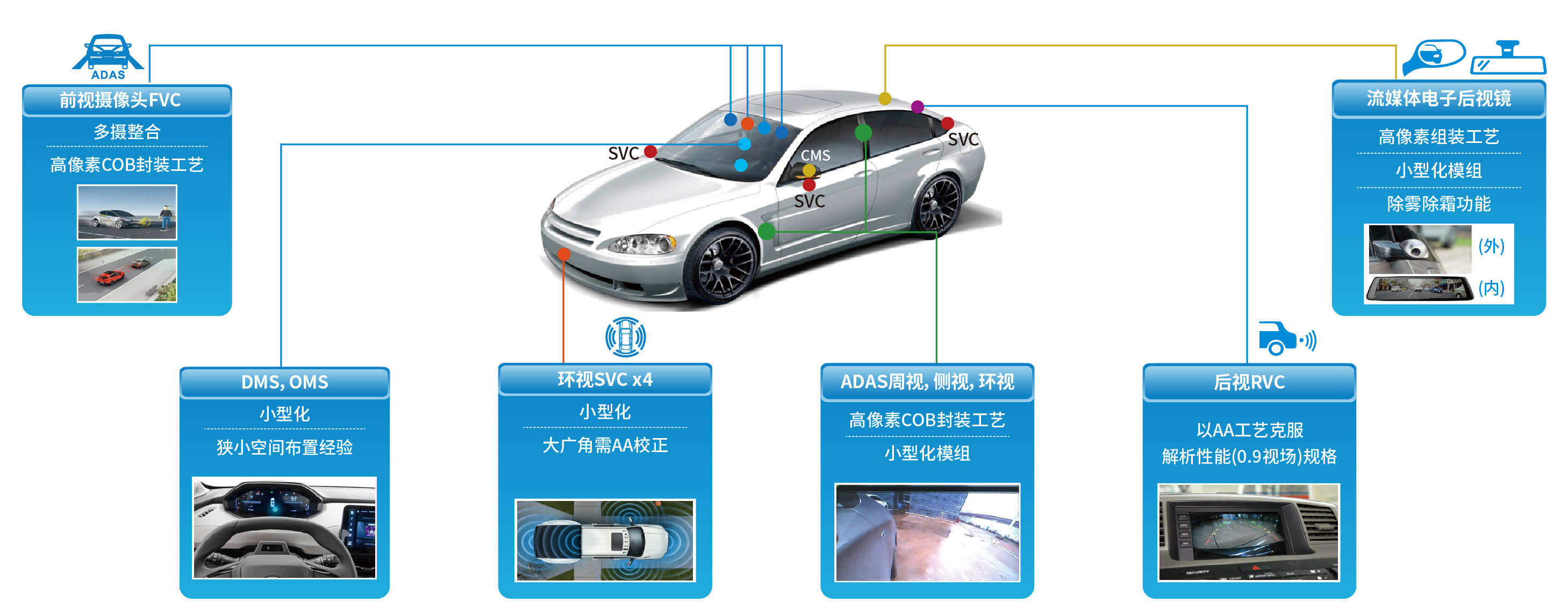 傳感器方面:公司為客戶提供全套攝像頭解決方案,包含:前視,側視,環視,電子外后視(CMS),駕駛員監控(DMS),乘客監控(OMS)等。產品覆蓋1M-8M,48M車頂云臺及12M、17M高像素產品即將量產。